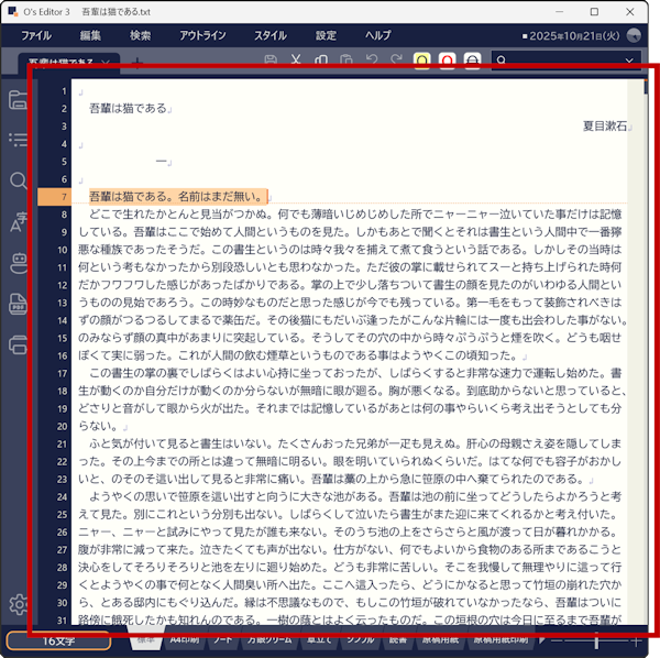 中央の大きな面積を占めるエディタ部分がテキストを執筆編集するためのエリアです。スタイルによってフォントや書式はさまざまです。スクロールバーは右側(スタイルによっては下側)に細長く折りたたまれています。マウスをスクロールバーの位置に合わせると幅広の状態になり、上下にスクロールさせることができます。スクロールバーには文頭や文末へ移動するボタンなども備わっています。エディタの編集は一般的な操作方法を踏襲しています。IMEはトゥルーインライン入力が標準となっており、作者の環境では[Microsoft