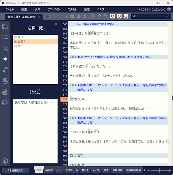 注釈バーは注釈の一覧を表示し、注釈の参照文をサイドバーの下部に表示するものです。注釈についてはこちらも参照してください。本文に注釈が1つもない場合は、アクションバーに注釈バーボタンは表示されません。