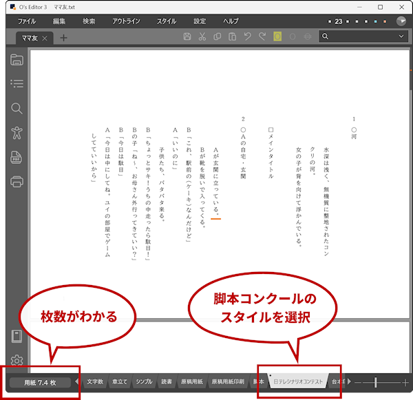 まず O's Editor3 で脚本を書きます。スタイルはどれでもかまいません。柱の先頭に○を挿入すること、台詞をカギ括弧で括る、この二つのルールだけ守ればOKです。全力で内容に集中してください。スタイルはどれを使ってもかまいませんが[脚本]スタイルや[台本印刷]であればト書きや台詞のインデントが自動的に施されるので読みやすくなりますが、慣れているのであれば標準スタイルでも問題なし。ときどき各脚本コンクール用のスタイルで最終形をざっと確認しておきましょう。書きながらいつでも自由にスタイルを変更できるのが