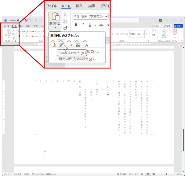 脚本コンクールのひな形ワードファイルから応募用のファイルを作成し、本文挿入部分に[元の書式を保持して貼り付け]を実行してください。[元の書式を保持]することによってインデントを保ったまま貼り付けることができます。貼り付けたら内容が正しく反映されているかどうか確認してください。脚本本文が問題なければ、あとは表紙やあらすじなどを加筆すれば応募ファイルの完成です。
