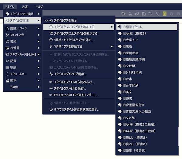 旧O's Editor2 のデフォルトスタイルについては O's Editor3 にあらかじめ実装されています。メインメニュー[スタイル|スタイルの管理|スタイルタブにスタイルを追加する]またはスタイルタブの右クリックメニュー[スタイルタブにスタイルを追加する]でスタイルタブに追加することが可能です。[旧標準スタイル]など頭に旧の文字が付いたスタイルが
