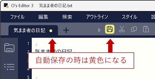旧O's Editor2 ですでに自動保存を行うことはできましたが、O's Editor3 では自動保存機能をさらに強化しました。メインメニュー[ファイル|保存の設定]の自動保存タブで[自動保存の方法]で選択できる項目が増えたほか、文書ごとに自動保存を行うかどうかを設定することも可能です。文書タブの右クリックメニュー[この文書の自動保存を有効にする]にチェックを入れてください。文書タブの小さな丸マークやツールバーの上書きボタンは自動保存かどうかで色が変わります。黄色が自動保存です。