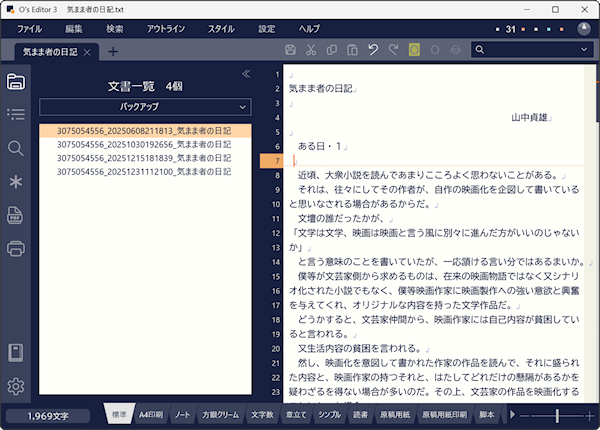 O's Editor3 が日々保存されるファイルからほどよい間隔で選んでバックアップします。こうすることでバックアップファイルが増えすぎることもありません。さらに不要と思われたバックアップファイルはいったんくずかごフォルダに移動され、くずかごフォルダが一杯になったら古いものから削除するという二段構えの手順になっています。バックアップファイルは元のファイル名の先頭にID番号と日付時刻が付加されたものになっており、文書バーの[バックアップ]カテゴリーで一覧され、ダブルクリックで開くことが可能です。バックアップを手作業でするのは大変面倒ですが、スマートバックアップならその煩わしさから解放され、いざという時にはバックファイルから過去の文章を探すことができるようになっています。執筆に専念するためのスマートバックアップ機能です。