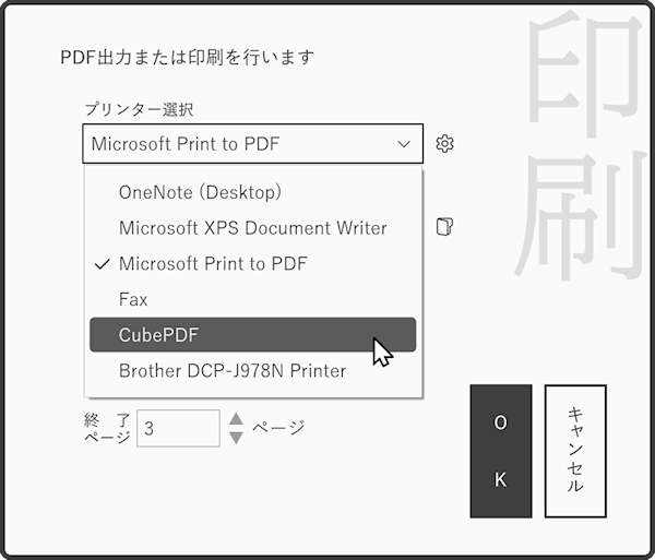 CubePDF を使ってPDFエクスポートすることも可能です。その場合は印刷を実行して[プリンターの選択]でCubePDFを選んでください。CubePDFは[Microsoft