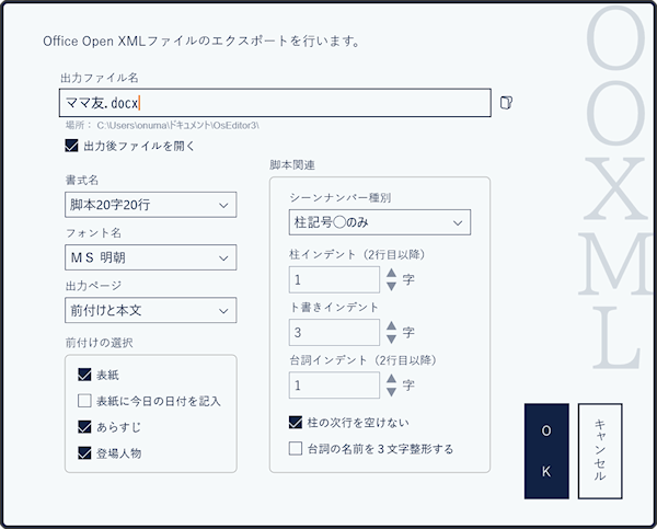 XMLファイル(OOXMLファイル)をエクスポートすることができるようになりました。映画やドラマの現場ではいまだにワードが主流ですので、脚本家がプロデューサーに脚本ファイルを送るときに有用だと思います。注意していただきたいのは