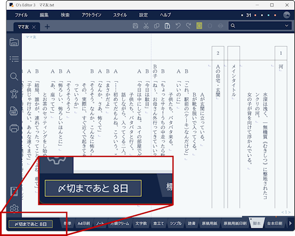 O's Editor3 では文書の〆切を設定することによって、〆切まであと何日かを表示することが可能になりました。プレッシャーになるので止めて欲しいという方もいらっしゃると思いますが、いよいよヤバくなった場合は勇気を出して表示しましょう。メインメニューの[ファイル|文書管理|文書規定|〆切日]または文書タブの右クリックメニュー[文書規定|〆切日]で〆切を設定し、スタイルタブの左側にある文書情報枠の表示を[〆切日]にすることによって「〆切まであと何日」と表示されます。また同様に文書規定で[台本ページ数]を設定しておけば、文書情報枠に規定ページ数と現在のページ数が表示され、同時に進捗ゲージが表示されます。