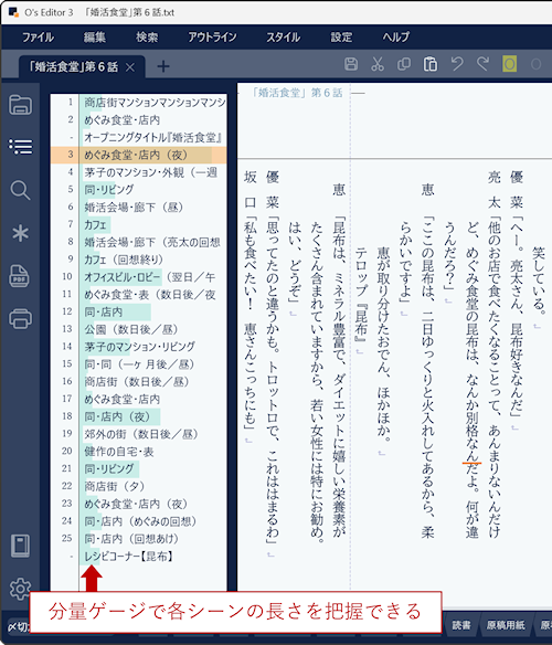 O's Editor3 に新しく装備されたアウトラインバーは O's Editor2 の見出し一覧から大幅な機能アップを果たしました。ツリー表示や文字サイズや行間など細かな表示設定が可能になっています。メインメニューの[アウトライン|アウトラインバー体裁|アウトラインバーの分量ゲージ]で分量ゲージをオンにすると各シーンの分量をグラフで表示でき、どのシーンが長いのかを視覚的に把握することが可能になります。構成を検討する一助になるかもしれません。