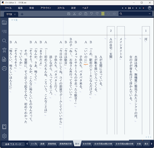 O's Editor3 にはあらかじめ脚本のためのスタイルがたくさん用意されています。“スタイル”とはフォントや色だけでなく折り返しなどの書式も含めた数多くの設定項目をワンクリックで変更できる O's Editor3 の代表的な機能です。スタイルを変更するには下部にあるスタイルタブをクリックするだけです。例えば[脚本]スタイルは柱に台本形式の罫線が施され、ト書きや台詞のインデントも自動適用される脚本執筆のためのスタイルです。[台本印刷]スタイルは映画やドラマの台本と同じ形式で表示編集印刷可能なスタイルです。脚本の文書を一つだけ作成すればスタイルを変更するだけでさまざまな体裁で編集することが可能なのが O's Editor3 の大きな特徴です。見た目は変わりますが文書自体は文字だけのシンプルなテキストファイルですので、他のアプリで開くことも可能です。