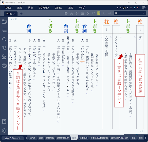 O's Editor3 が柱、ト書き、台詞を認識するアルゴリズムは至ってシンプルです。①行の先頭に○(丸文字)があれば柱とする。②文中にカギ括弧があれば台詞とする。③それ以外はト書きとする。それだけです。ですので柱を書くときには最初に○を記入すればよいし、名前のあとにカギ括弧を使って台詞を書けばその行は台詞として認識されインデントも自動的に適用されます。